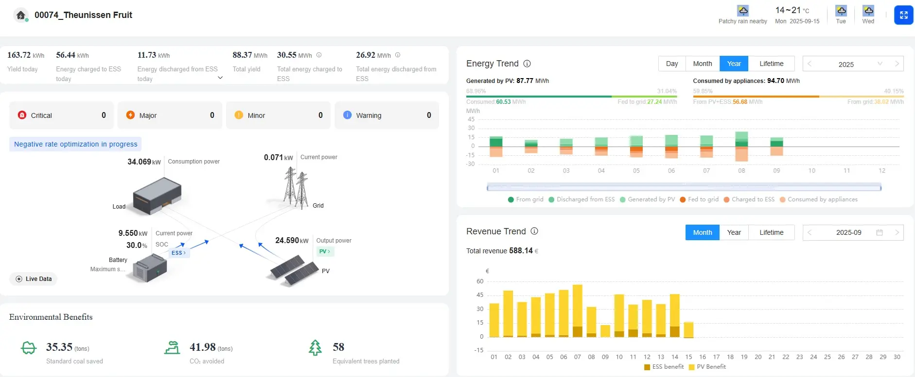 In Voeren kiest Theunissen Fruit voor een toekomst waarin landbouw en technologie hand in hand gaan. Met een PV-installatie van 115 kWp en een batterijopslag (BESS) van 100 kW / 200 kWh optimaliseert het familiebedrijf zijn energieautonomie.